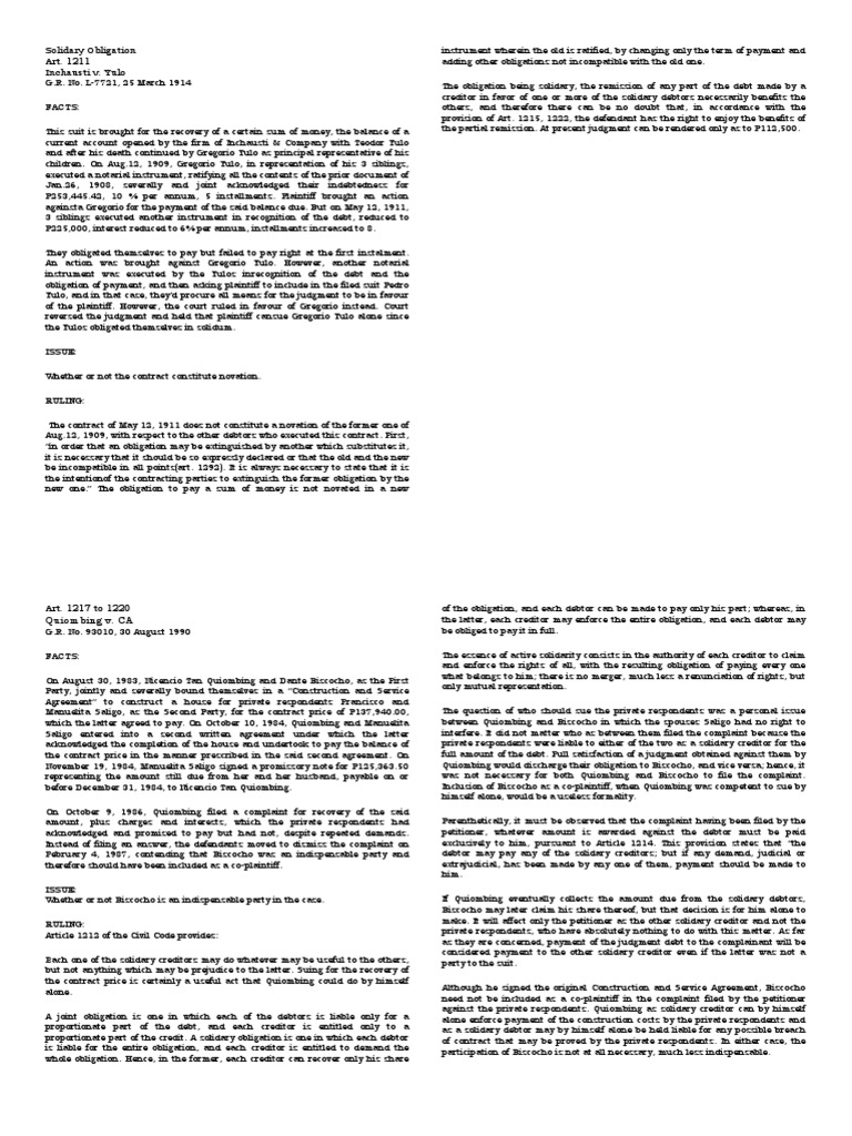 Example Of Solidary Obligation : JOINT AND SOLIDARY OBLIGATIONS WORDS INDICATING A SOLIDARY ... : A solidary obligation, or an obligation in solidum, is a type of obligation in the civil law jurisprudence that allows either obligors to be bound together, each liable for the whole performance, or obligees to be bound together, all owed just a single performance and each entitled to the entirety of it.. Gono enter into a contract to deliver 500 cavans of rice to rhea with a price per cavan of 1,300 pesos, gono delivered 300 cavans but withheld the delivery of the remaining, stating that the price went up and priced the. Feb 21, 2019 · thus, where kitty and baste promised in solidum to pay leni lowbredo p10,000.00, we have an example of a solidary divisible obligation. Jul 17, 2012 · civil obligation ‐ obligations which give to the creditor or obligee a right under the law to enforce their performance in courts of justice natural obligations ‐ not being based on positive law but on equity and natural law, do not grant a right of action to enforce their performance although in case of voluntary fulfillment by the debtor. Violence or intimidation shall annul the obligation, although it may have been employed by a third person who did not take part in the contract. Moral obligation and duty is not stated in the punishment, because this is generally understood.